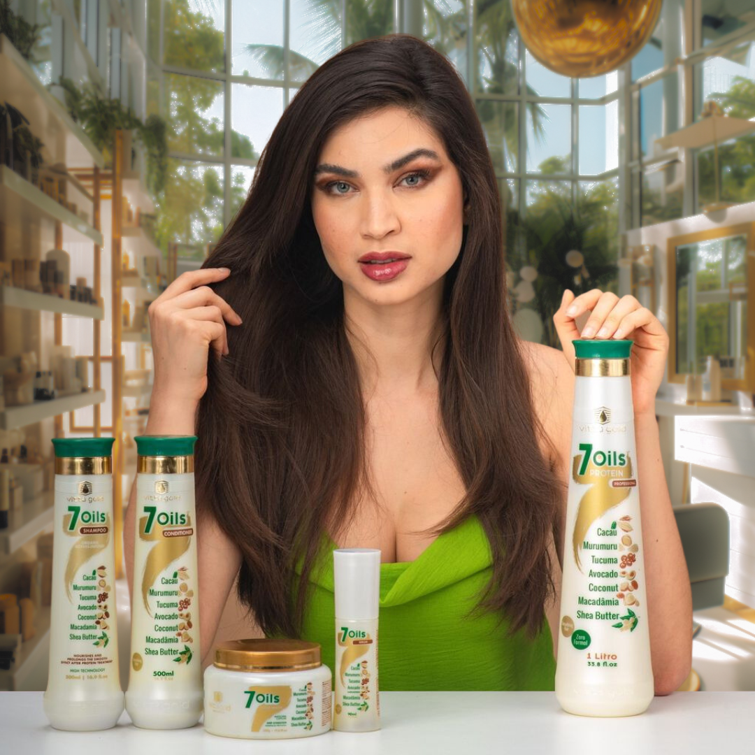 Desvende o segredo para cabelos incrivelmente lisos com 7 Oils - nossa solução de alisamento capilar de alta tecnologia e sustentável.